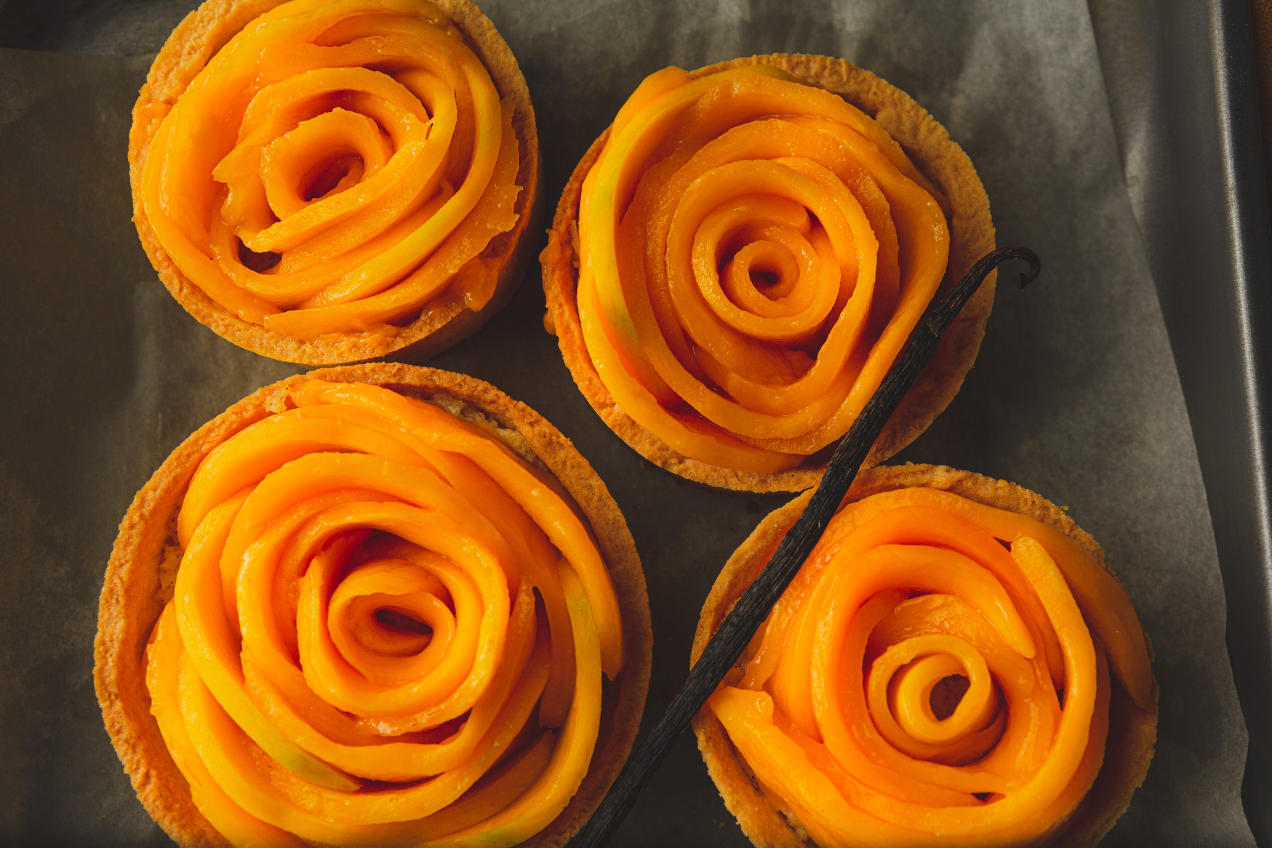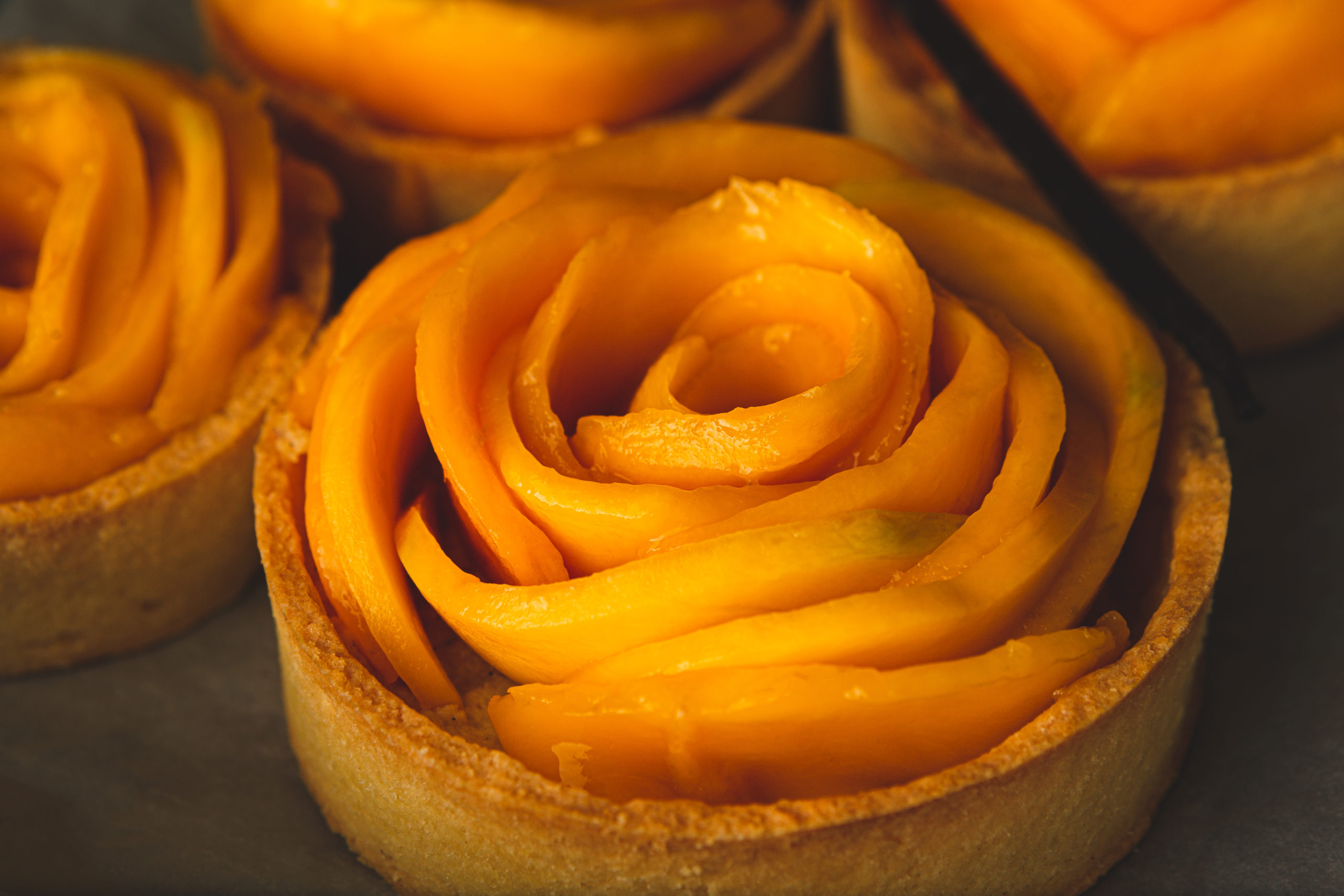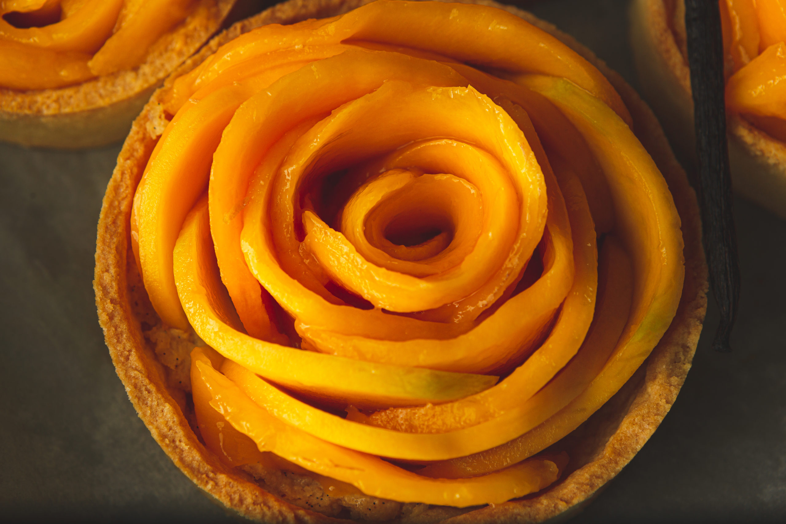 Vous allez vous rendre compte assez vite que la mangue et moi, c’est une grande histoire d’amour, vous allez même la retrouver là où vous ne vous l’attendez pas. Ce fruit riche en vitamines C et B9 apportera également le côté sucré & floral (héhé) qui sera une parfaite combinaison avec l’onctuosité de la crème pâtissière qui tapisse le fond de tarte.