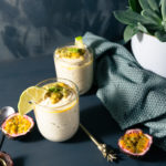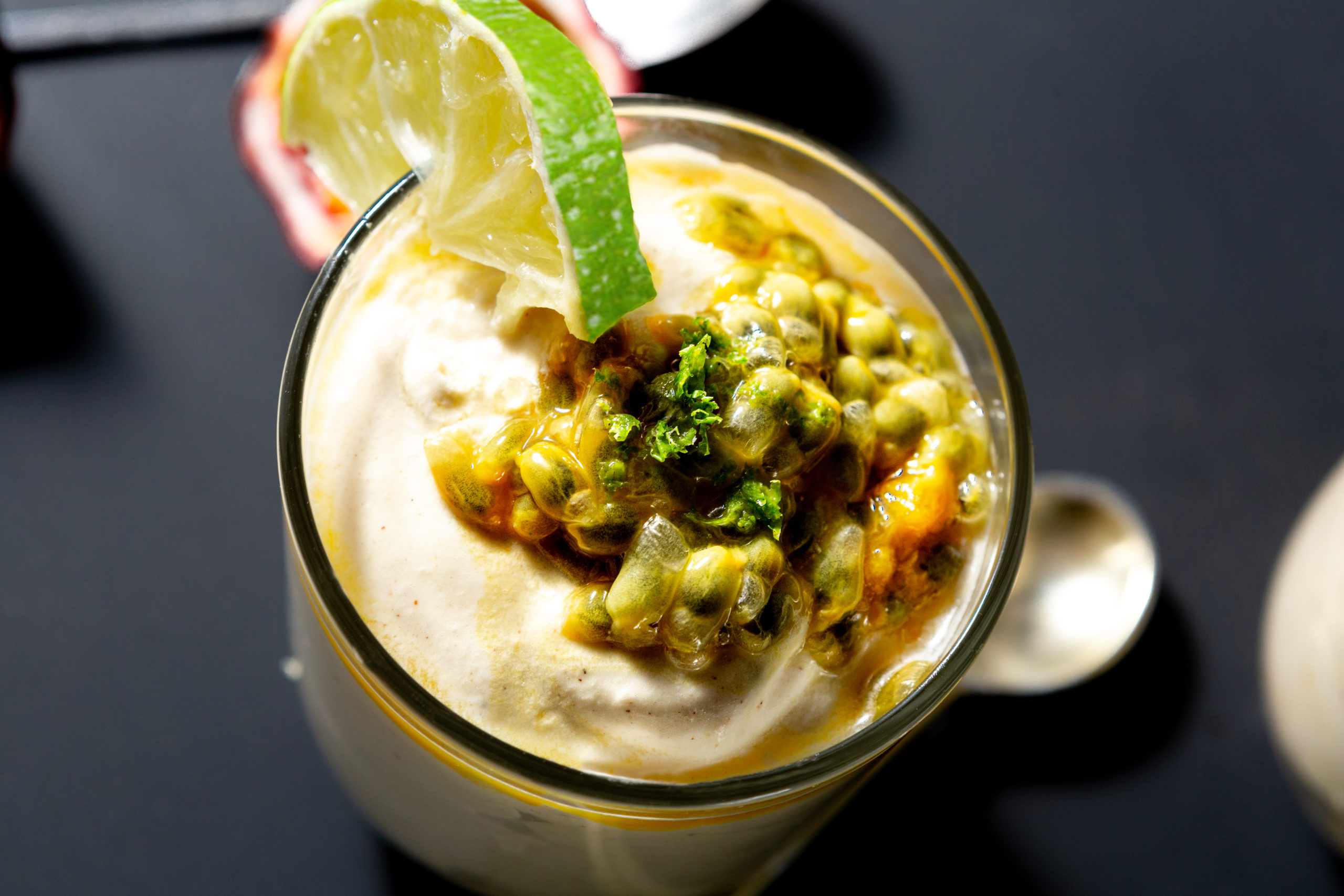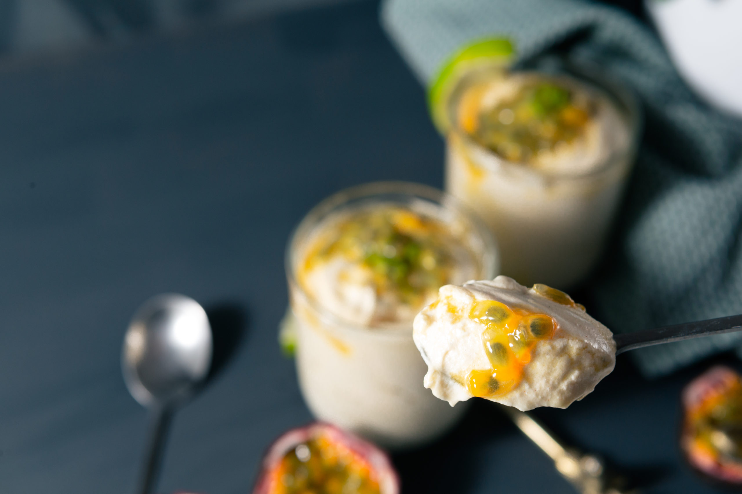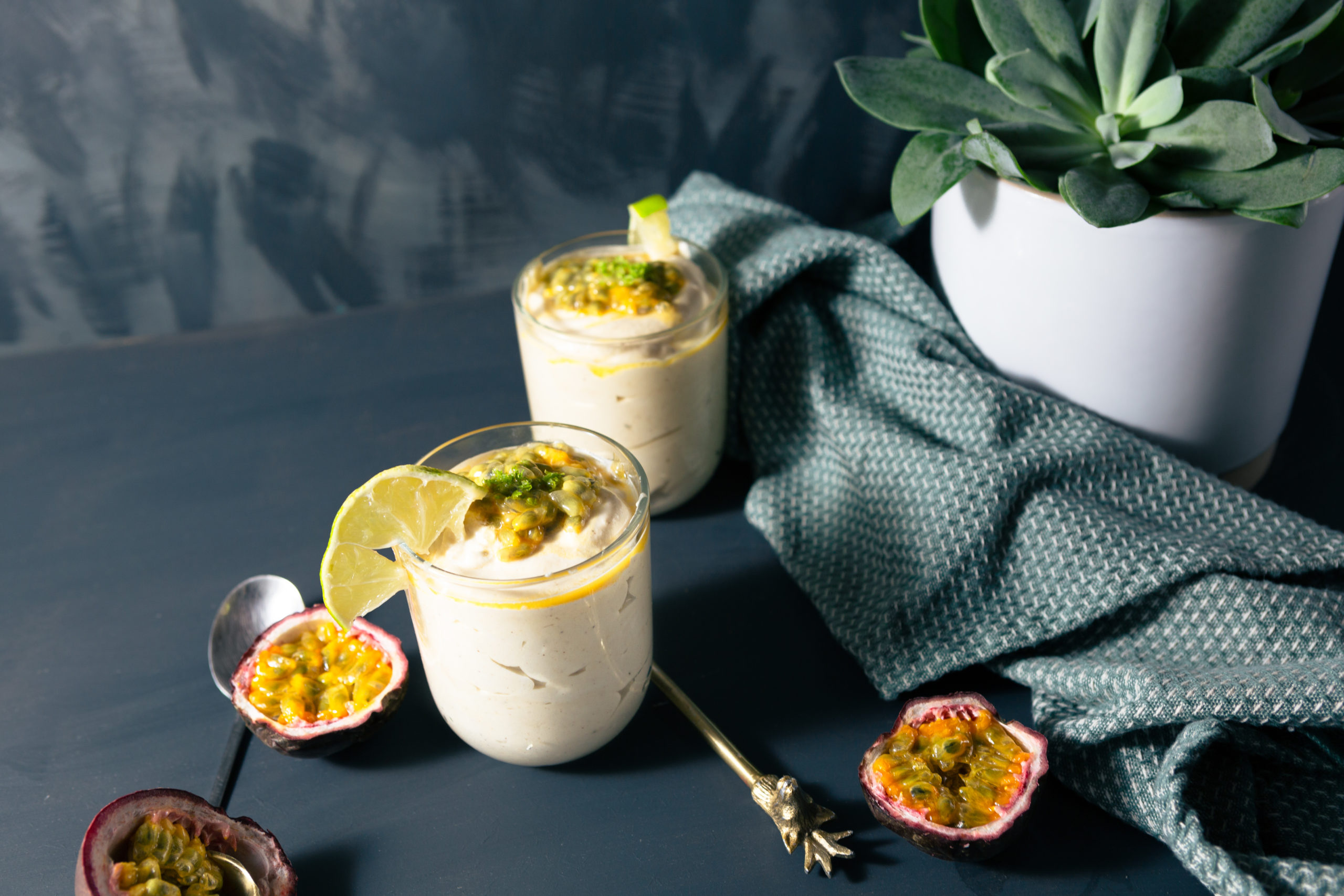 Servez avec le fruit de la passion au dessus et du zeste de citron vert (facultatif).