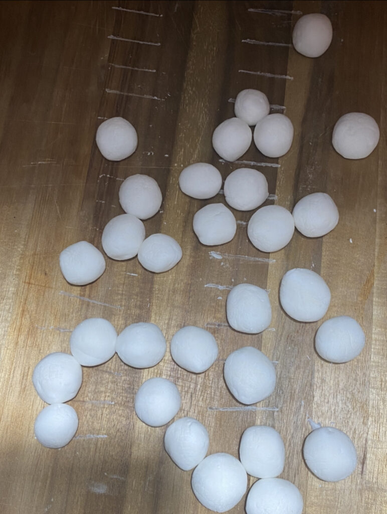 Découper des petites portions pour former les ravioles (attention la pate gonfle un peu à la cuisson) roulez les portions en boule et aplatissez-les en disque.
