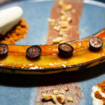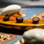J’ai exploité sa facilité à se caraméliser pour ajouter du croquant juste avec un peu de sucre. Toujours en complémentarité des goûts nous avons les myrtilles pour plus de fraicheur et un gout acidulé puis les noisettes grillés qui vont apporter du relief et un côté fumé au dessert.