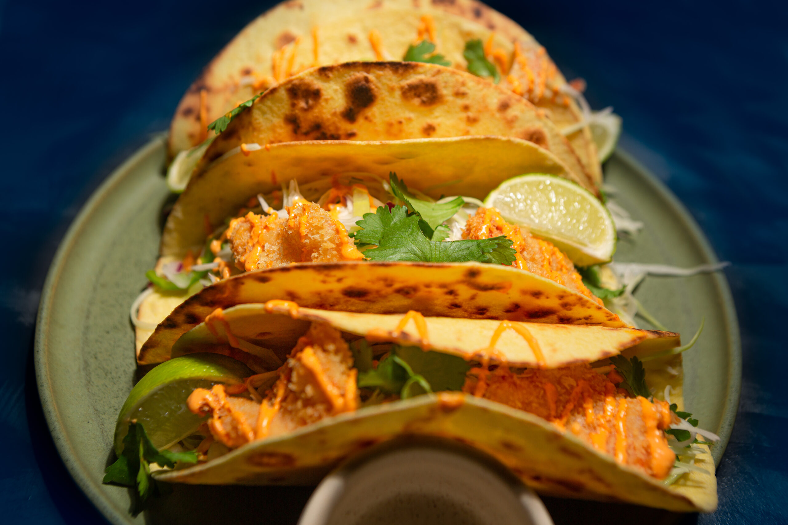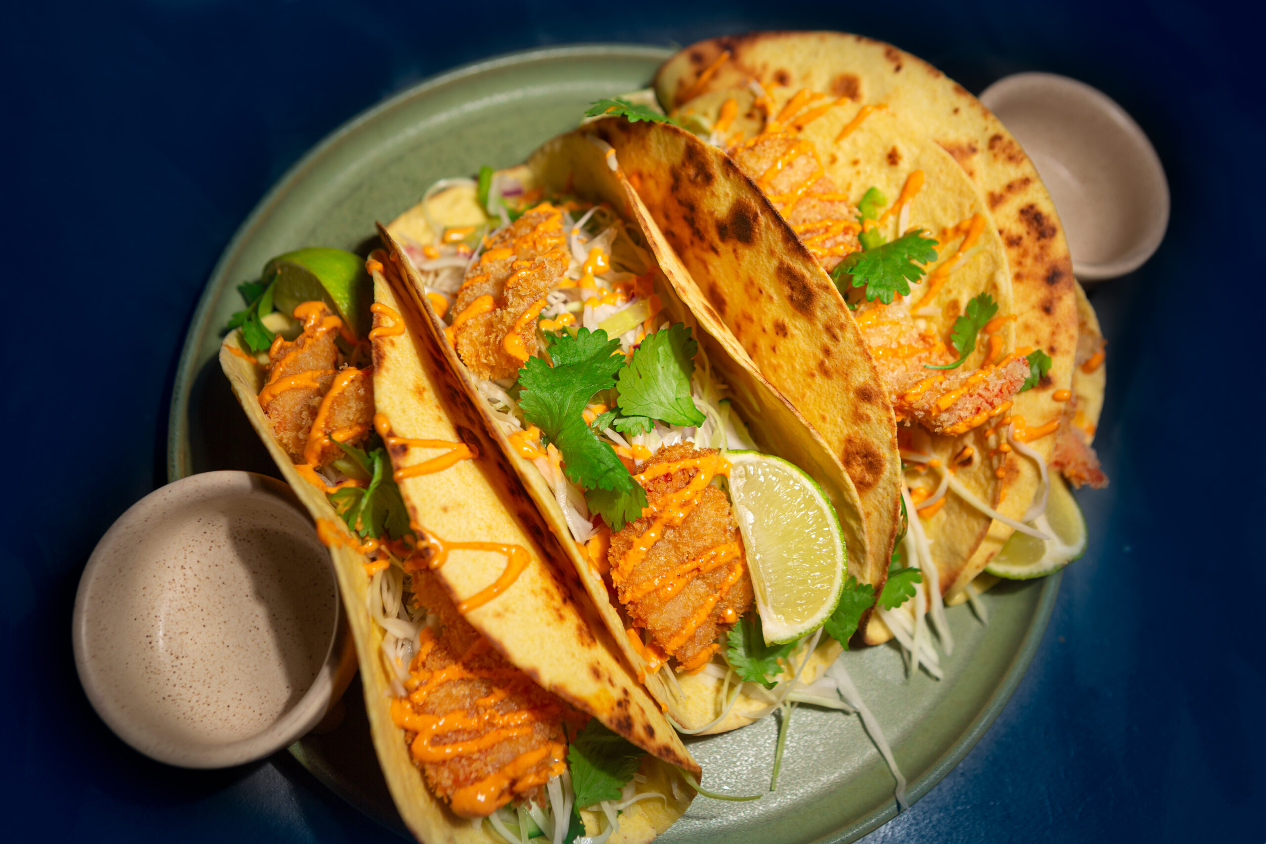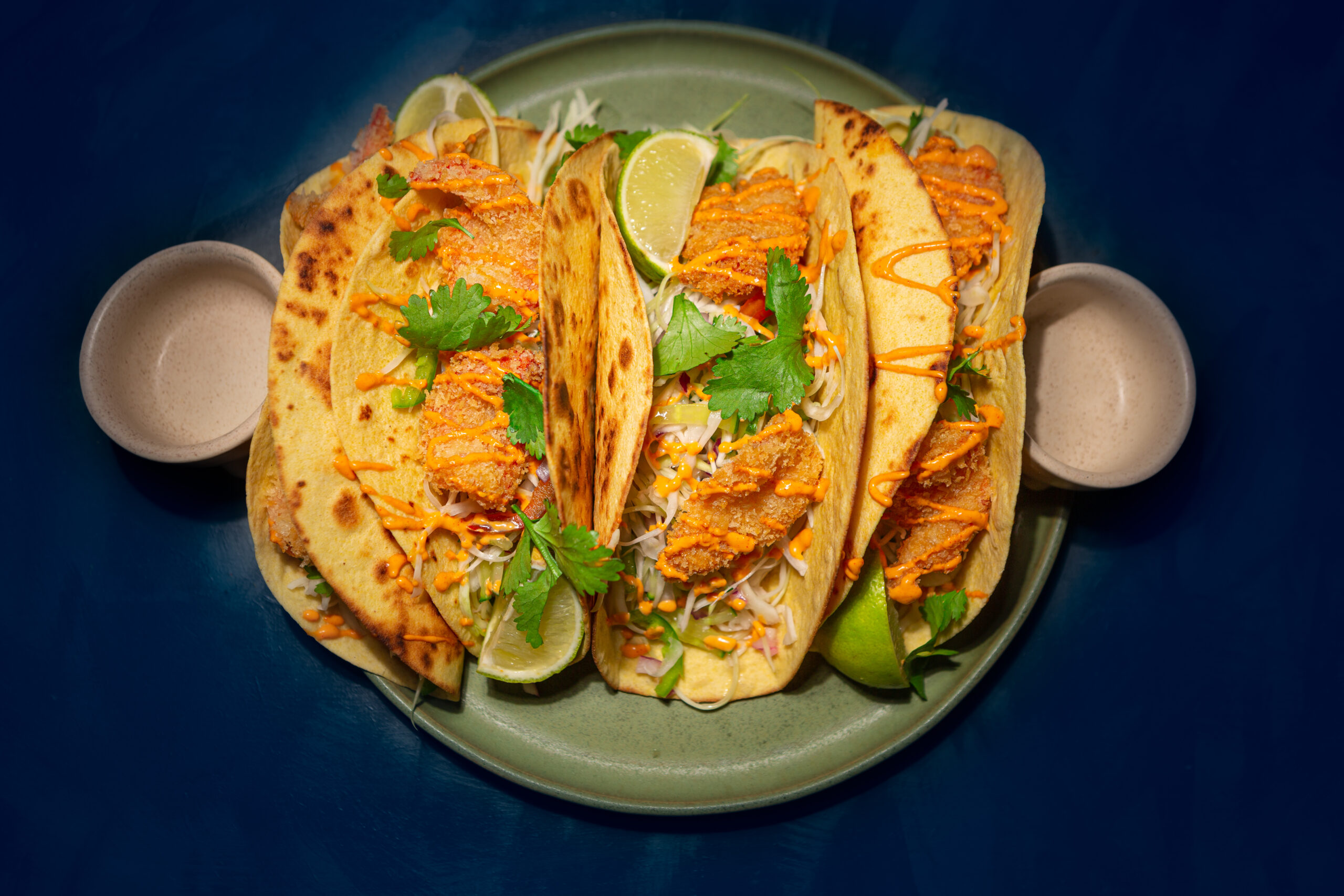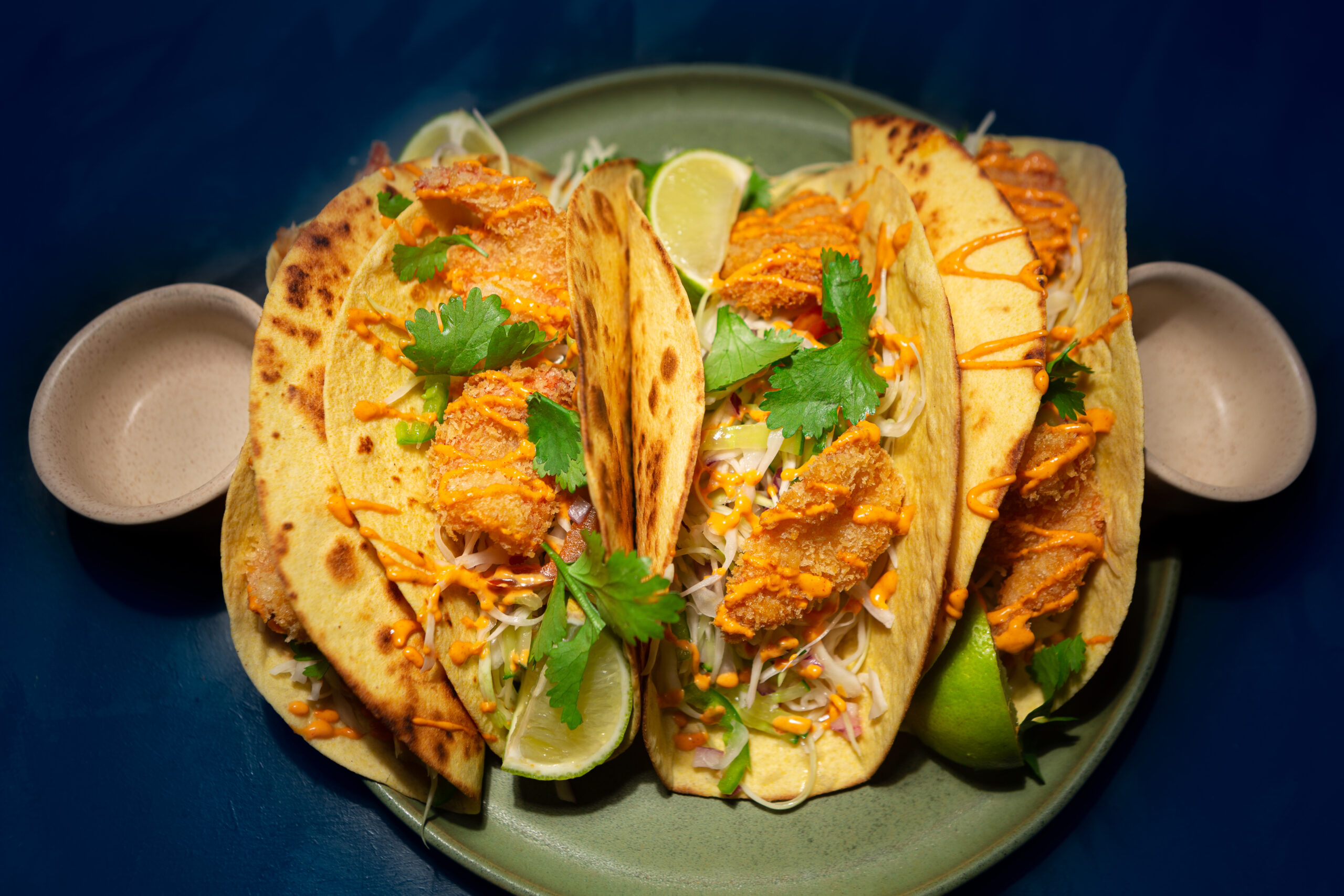 In a pan or plancha, heat the tortilla wraps 1 min on one side, and fold them immediately to give the desired shape.