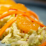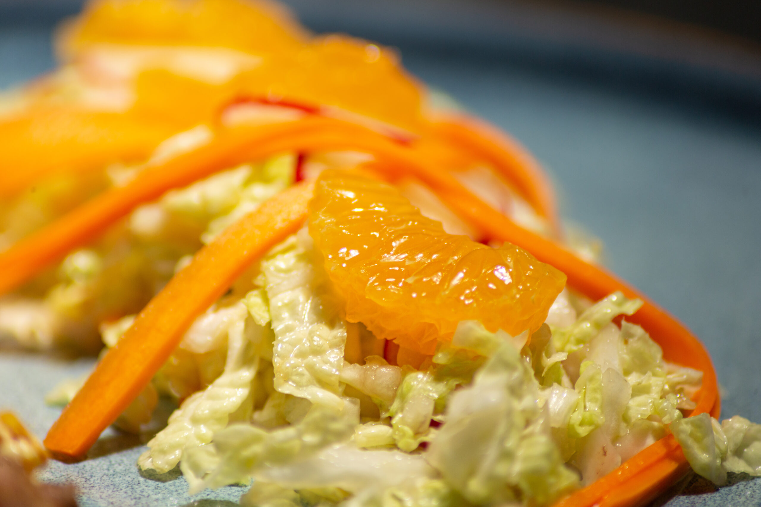 On a également une petite dose de sucré-salé avec l’intégration du sucre de palme et des clémentines qui sont de saison et s’agrémentent très bien avec les éléments de la salade.