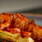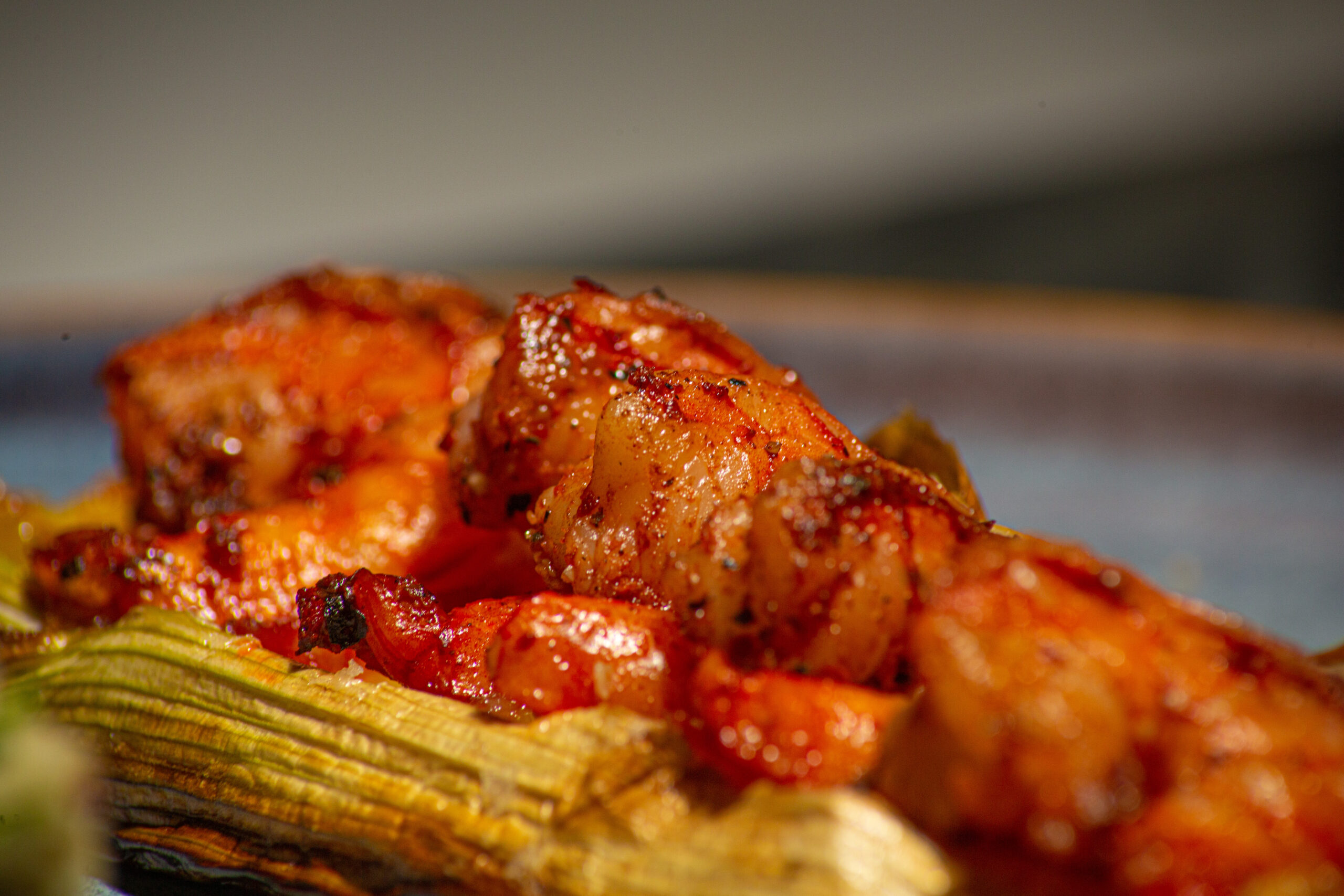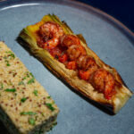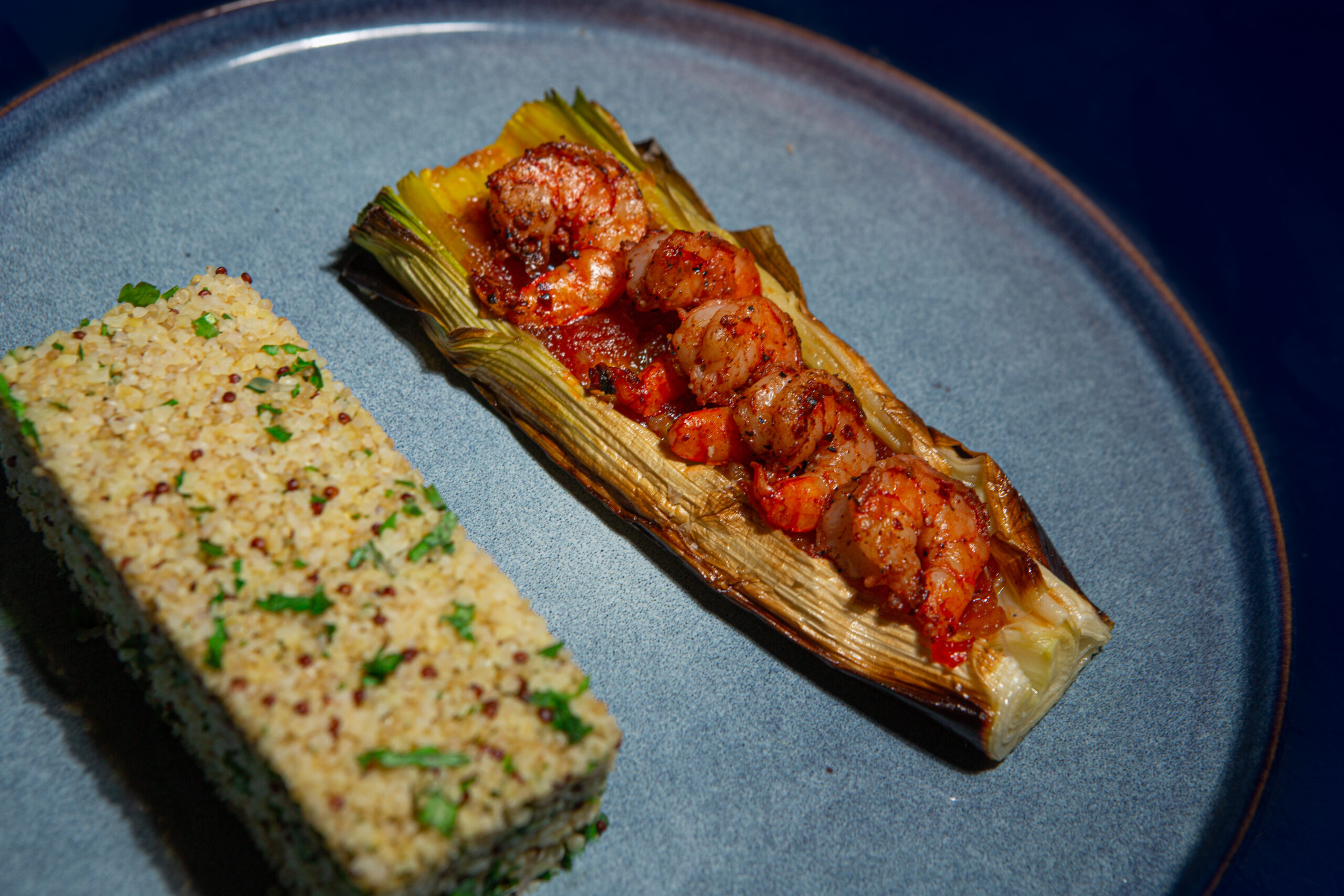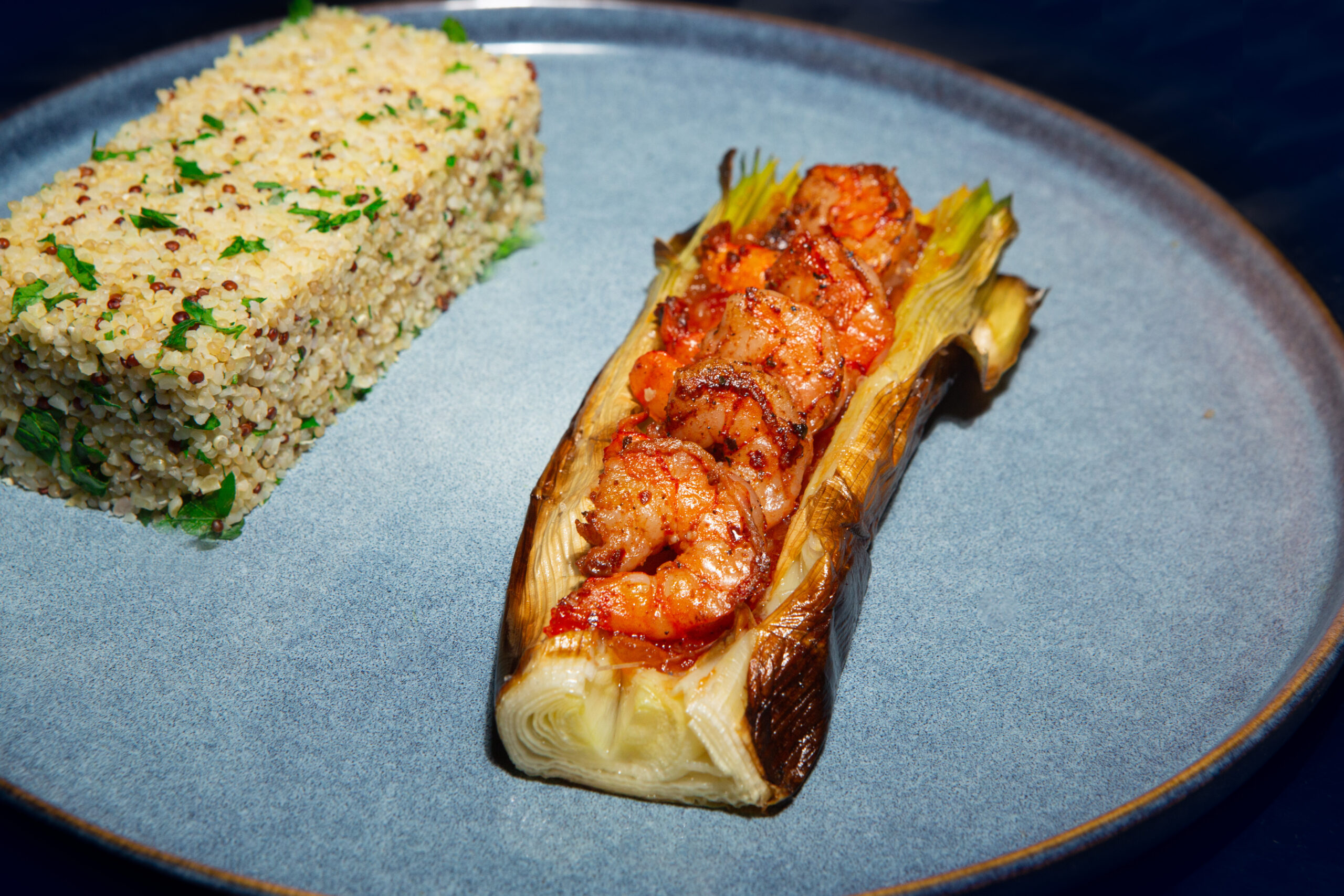 Poireau au four x confiture de tomates, gambas & quinoa citron persil