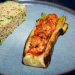 Ouvrez le poireau dans le sens de la longueur pour y ajouter la confiture de tomates et les gambas, servez avec le quinoa.